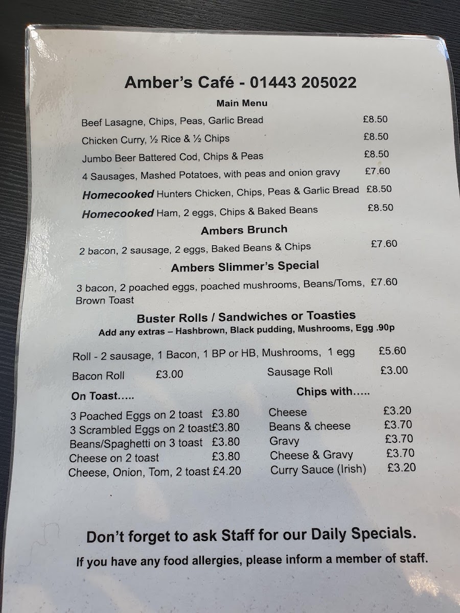 Ambers Cafe Menu